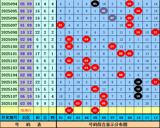 后区号码分析:在第109期历史同期开奖中奖,奖号12出现6次,奖号02 05 06 11出现4次,奖号09 10出现3次,奖号03 08出现2次,奖号01 07出现1次,奖号04没有出现。本期后区五码参考02、05、06、10、12。