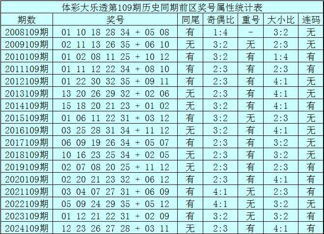 体彩大乐透第109期历史同期开出17次奖号,其统计详见下表: