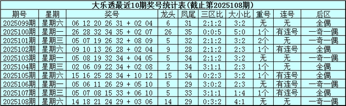 大乐透第2025108期奖号为:14、18、21、24、29+03、06。其中前区三区比为0:3:2,大小比为4:1,没有出现重号,没有出现连号,后区为一奇一偶号码。