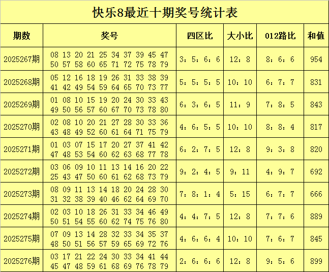 福彩快乐8第2025276期开奖回顾:03 17 21 22 24 30 33 34 41 44 45 47 48 59 61 68 69 76 78 79,其中奖号四区比为2:6:6:6。
