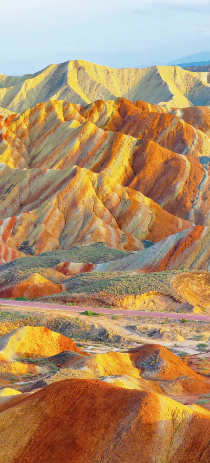 没有一丝植被覆盖的丹霞地貌,在阳光照射下呈现出红、黄、橙、绿、白、青灰等多种色彩,层理交错、岩壁陡峭。