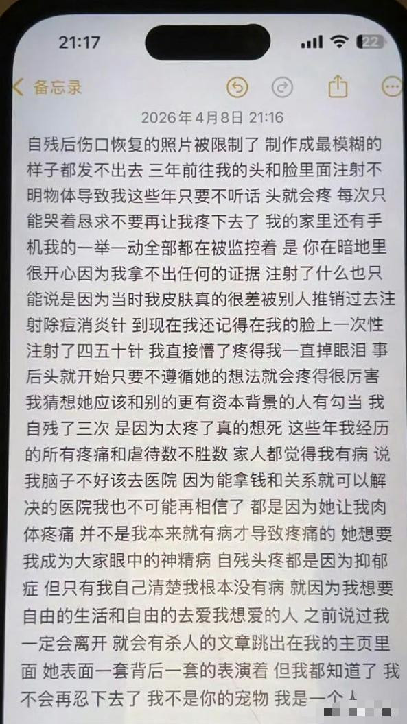她把自己三年以来自残的伤痕以及被人控制的不堪经历全部爆了出来,