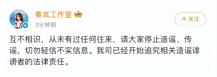 4月9日上午,她的工作室也发出声明,表示和金子涵从来不认识,也没有任何交集,