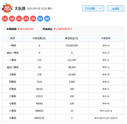 大乐透第2025108期开奖号码为:14、18、21、24、29+03 06。其中前区奖号三区比为0:3:2,奇偶比为2:3,没有开出重号,后区分布在一、二区。