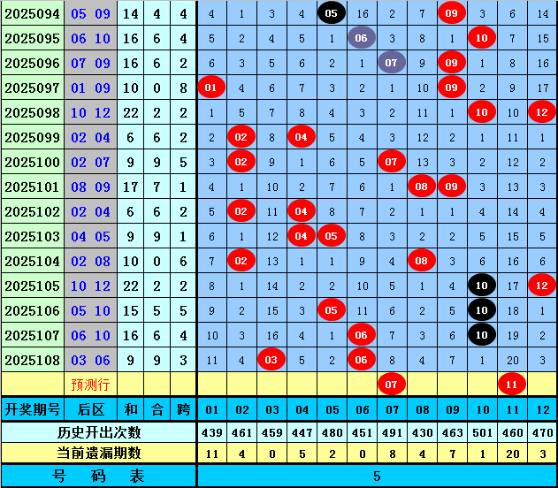 后区分析【一区01-04,二区05-08,三区09-12】:上期后区奖号为03和06,分别落在第一、二区,近50期后区三区比为38:30:32,近10期三区比为8:7:5,本期注意第二、三区号码出现,关注两码07+11。