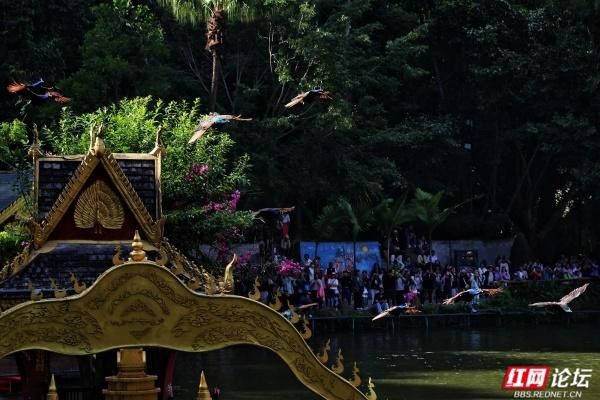 蓝衫姑娘抖着彩裙旋身,银饰撞出的脆响裹在蕉叶香里,连布景壁画上的泼水少女,都像要从蓝浪里跳出来碰杯。日头斜下去时,风里浸着米酒甜。这里的热闹从不是刻意铺排,是孔雀栖过肩头,是舞蹈踩着水花,是每口呼吸都裹着热带的生动。(图/文:彭定湘)