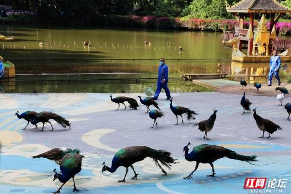 转过廊桥撞见孔雀广场,一群蓝绿尾羽的孔雀踱过彩砖,翅尖扫过游人的草帽,茸毛落在手背上。游客递出的香蕉被大象用灰褐长鼻一卷,粗粝触感裹着温软的力气,象鸣混着孩童的笑滚进林子里。